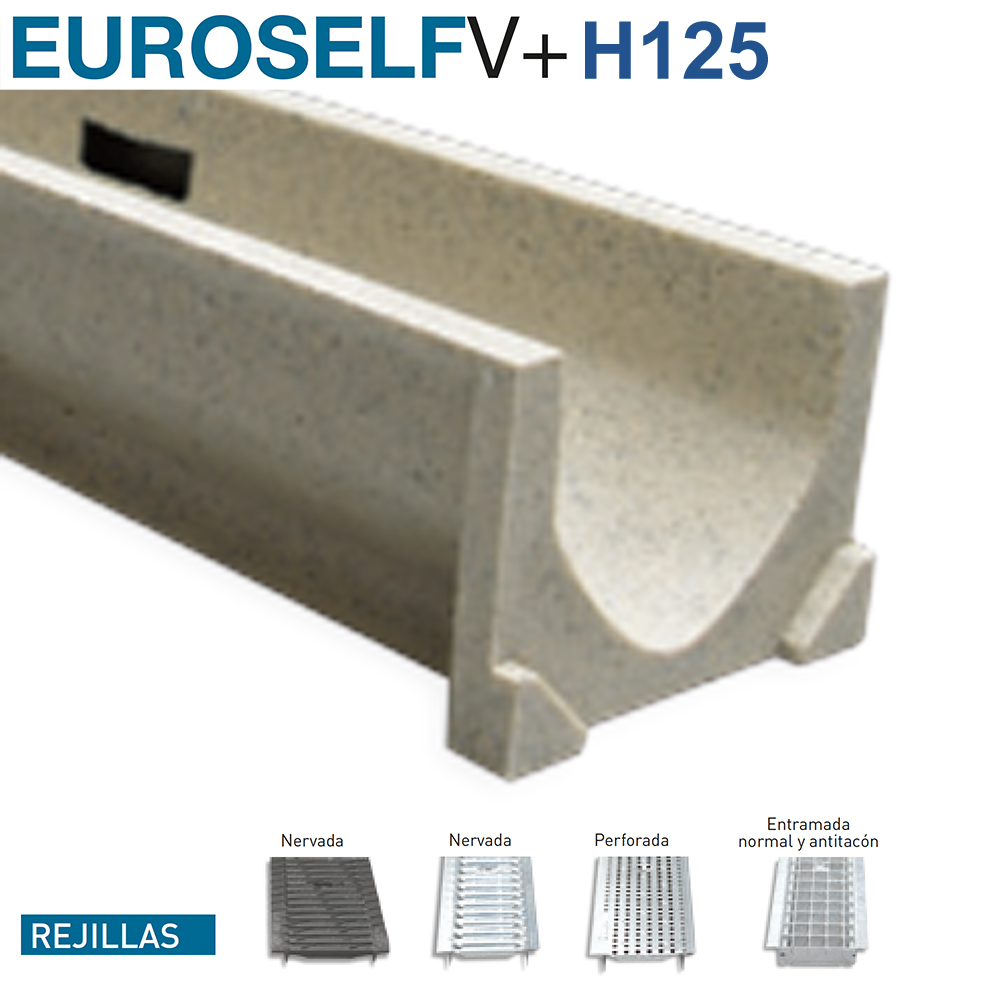 Canal de Hormigón Polímero tipo ULMA, modelo EUROSELFV+, ancho exterior 130mm, ancho interior 100mm y altura exterior 125mm, para recogida de aguas pluviales, en módulos de 1 ML de longitud, sección en V optimizada con efecto autolimpiante especialmente diseñada para tramos de canal sin pendiente longitudinal, cancela de seguridad y tornillería correspondiente.