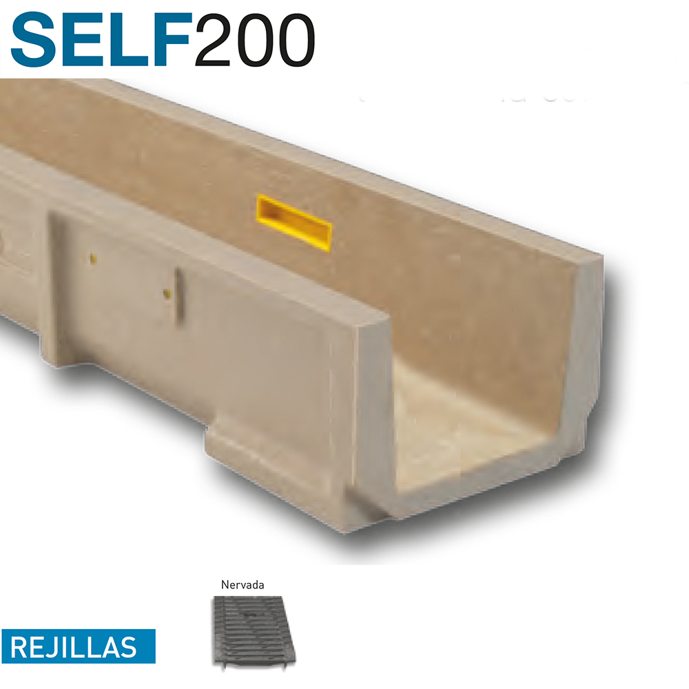 Canal de Hormigón Polímero tipo ULMA, modelo SELF200, ancho exterior 204 mm, ancho interior 150 mm y altura exterior 140 mm, para recogida de aguas pluviales, en módulos de 1 ML de longitud, cancela de seguridad CS150 y tornillería correspondiente.